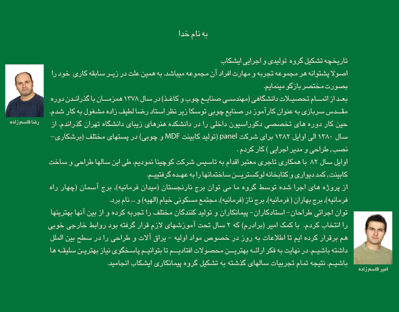 ایشکاب (ISHCAB) ، مجری کابینتهای لوکس آشپزخانه از سال 1380 فعالیت خود را آغاز نمود ودر این مدت باتشکیل گروهی مجرب از مهندسان معماری و صنایع چوب پاسخگوی نیاز شما به کابینت آشپزخانه ( کابینت مدرن و کابینت کلاسیک ) می باشد. در طراحی یک کابینت همواره در نظرداریم که با استفاده از تجارب پیشکسوتان این صنعت وهنر در دنیا ، استفاده نموده ودر عین حال نیازهای یک کابینت لوکس و کاربردی (( ایرانی )) را برآورده سازیم.